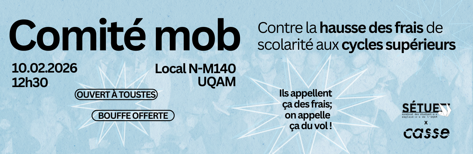 Nous vous convoquons donc à un comité de mobilisation consacré à cet enjeu. L’objectif est de regrouper les personnes directement concernées et celles qui souhaitent contribuer à l’organisation, afin de coordonner nos actions, partager l’information, et préparer des moyens de pression.